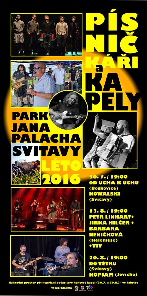 Koncert v parku Jana Palacha 20. 8. 2016 0 komentářů Již tuto sobotu, dne 20.8. koncert v parku Jana Palacha ve Svitavách. Dvojkoncert se skupinou Kopjam Jevíčko. Začátek je v 19:00 hodin. Vložit komentář Zrušit odpověď na komentář Vaše emailová adresa nebude zveřejněna. Vyžadované informace jsou označeny *Komentář Jméno * E-mail * Webová stránka